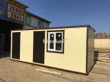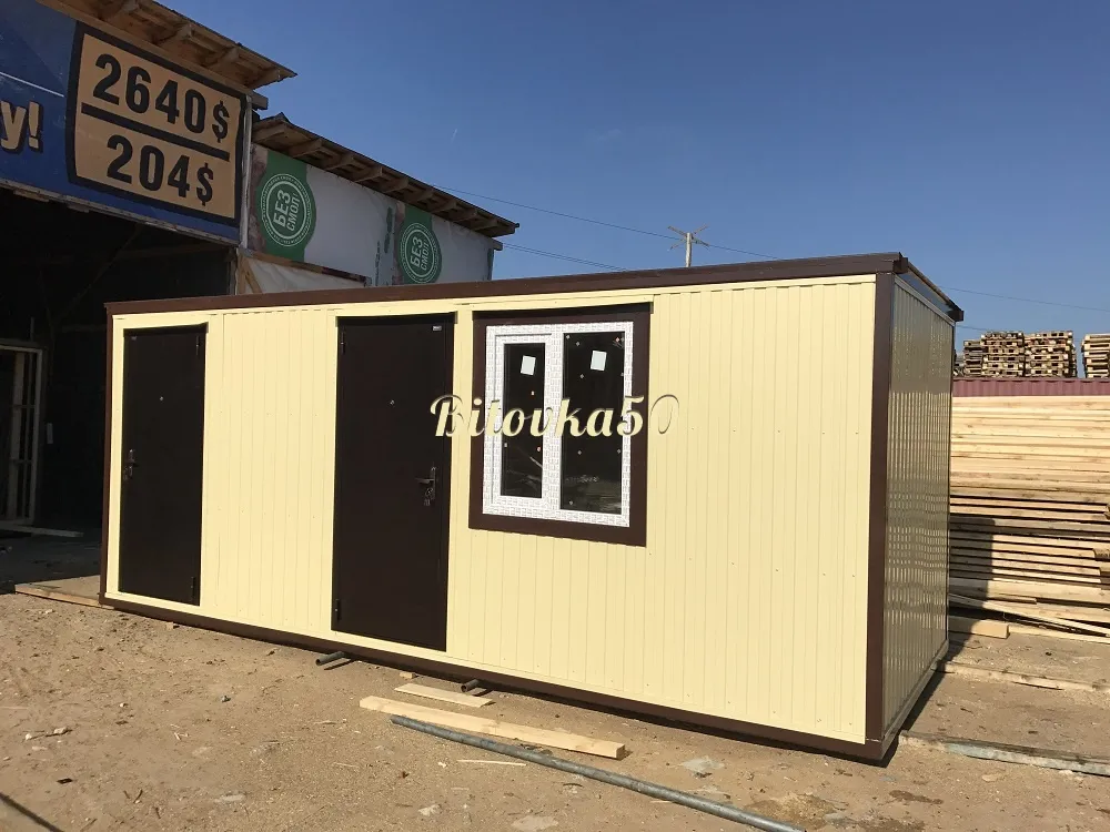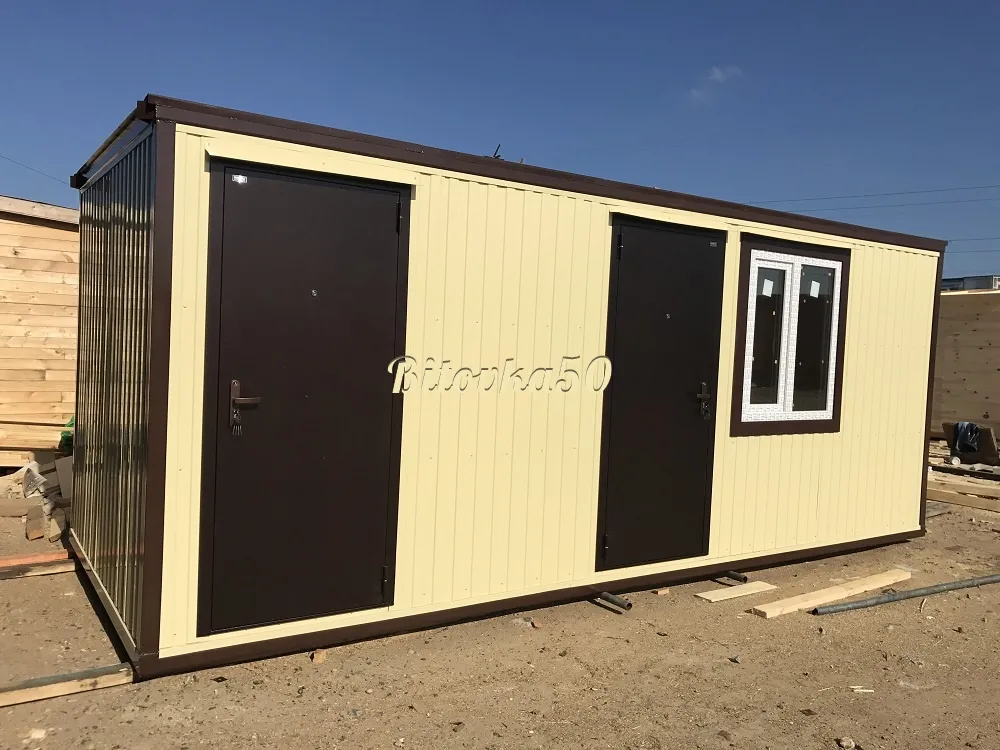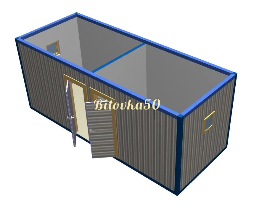 Металлические бытовки, которые имеют два изолированных друг от друга отсека (комнаты), нужны, когда вагончик хотят поделить на отдельные помещения. В отличие от моделей с планировкой «распашонка» этот вариант не имеет тамбура, а также общей входной двери. У каждой комнаты есть свой дверной проём. Планировка позволяет использовать блок-контейнер для: