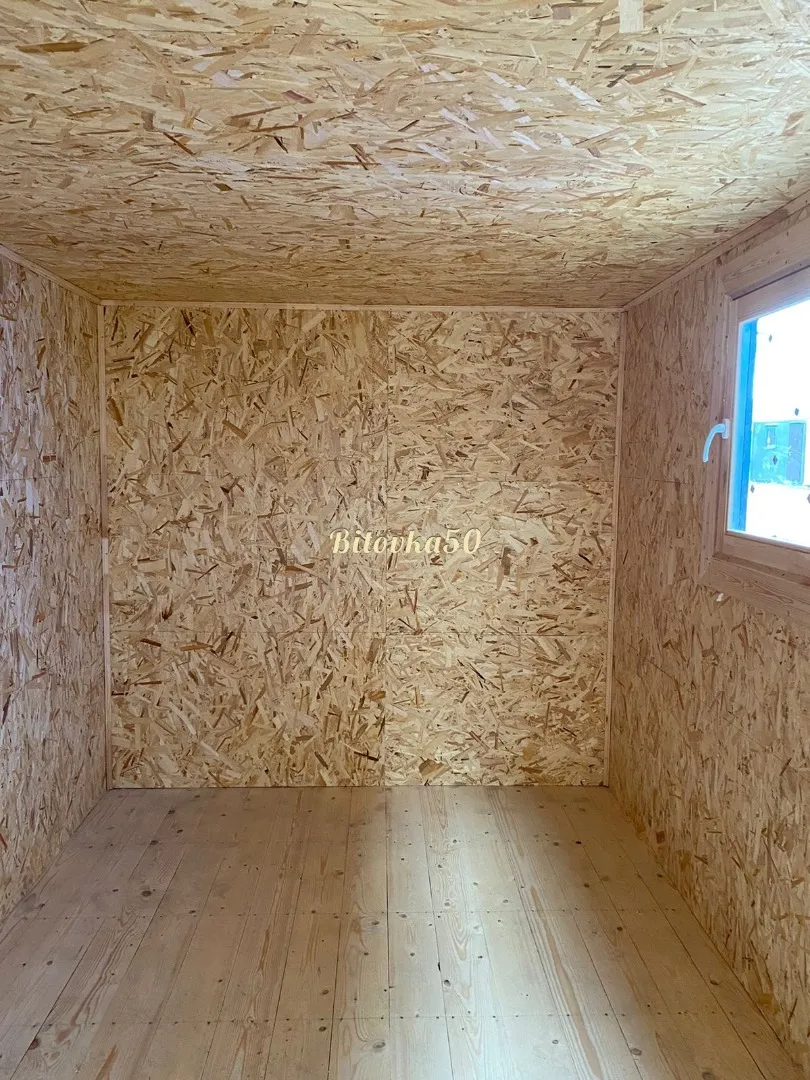 Для чистового пола мастера «Бытовка50 » используют листы ДСП толщиной 16 мм. Это не самый долговечный материал. Он плохо переносит влагу, а также точечные нагрузки. Но если при эксплуатации вы будете учитывать это, то он сохранит вид на много лет. В качестве опции возможен настил линолеума в блок контейнере.