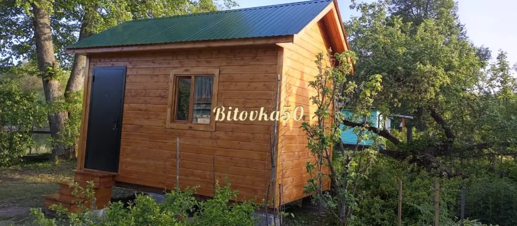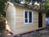 Внутри и снаружи все наши бытовки отделаны длинной евровагонкой. Это придаёт строению красивый внешний вид. В бытовке два окна, расположенных по обе стороны от входной двери, которая в свою очередь является филёнчатой заводской, шириной 70 или 80 см. По всему периметру наши бытовки утеплены, а также защищены от ветра и влаги при помощи самых современных материалов.