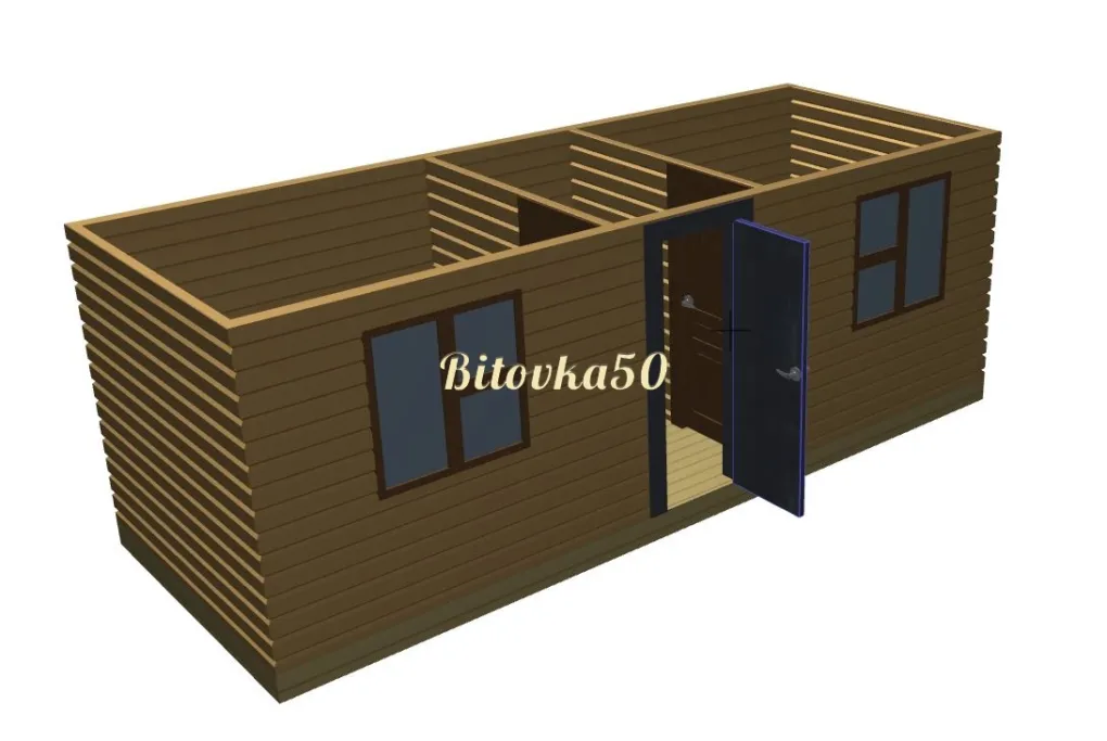 Удачный выбор для круглогодичного проживания за городом или размещения бригады строителей. Дачная бытовка этой модели состоит из двух изолированных жилых комнат и компактного тамбура. В стандартную комплектацию бытовки-распашонки входит две филёнчатые межкомнатные двери, два окна с двойной рамой размером 1×1 метр и металлическая входная дверь отечественного производства. Планировка дома позволяет обустроить удобное жильё для небольшой семьи – одна из комнат может служить кухней или совмещать функции кухни и столовой. Благодаря наличию тамбура холодный воздух и уличная грязь не попадает внутрь жилых помещений.
