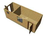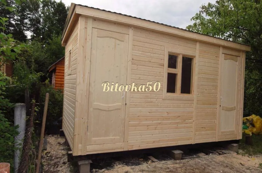 Эта модель удобна для владельцев дачных участков, желающих объединить под одной крышей жилое и хозяйственное помещения. Садовый дом состоит из двух изолированных комнат, разделённых перегородкой. Каждая комната имеет отдельный вход с разных сторон здания. В комплектацию каркасной дачной бытовки включены две входных двери, одно большое и одно маленькое окно с двойной рамой и одинарными стеклами. Второе помещение может служить летней кухней, кладовкой для хранения инвентаря, сараем для мелкой живности или мастерской. В каталоге производителя представлены двухкомнатные бытовки для дачи с двумя отдельными помещениями, длиной от четырёх до восьми метров. За дополнительную плату к бытовке можно пристроить крыльцо, веранду или навес для дров.