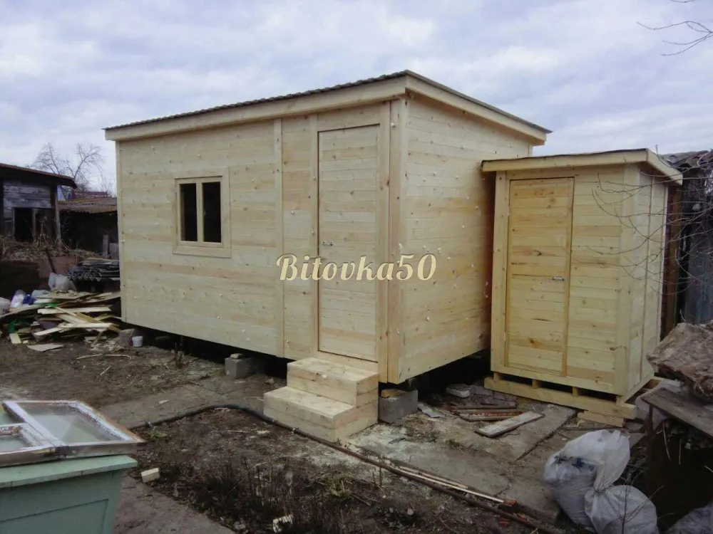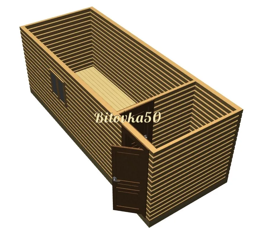 На период постройки частного дома необходимо решить вопрос временного проживания бригады строителей. Компания-производитель предлагает купить бытовку строительную, состоящую из жилой комнаты и прихожей-тамбура. Такую бытовку можно привезти и установить на участке в собранном виде, в ней можно разместить на проживание бригаду из трёх-четырёх человек. Тамбур служит удобной раздевалкой и позволяет сохранить тепло внутри жилого помещения.