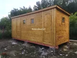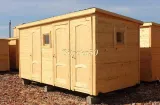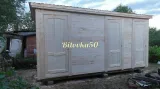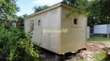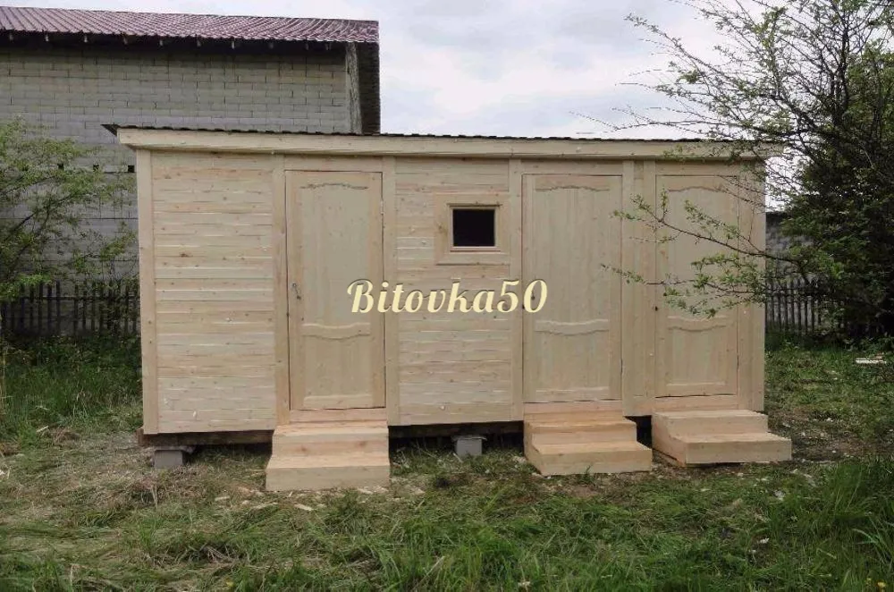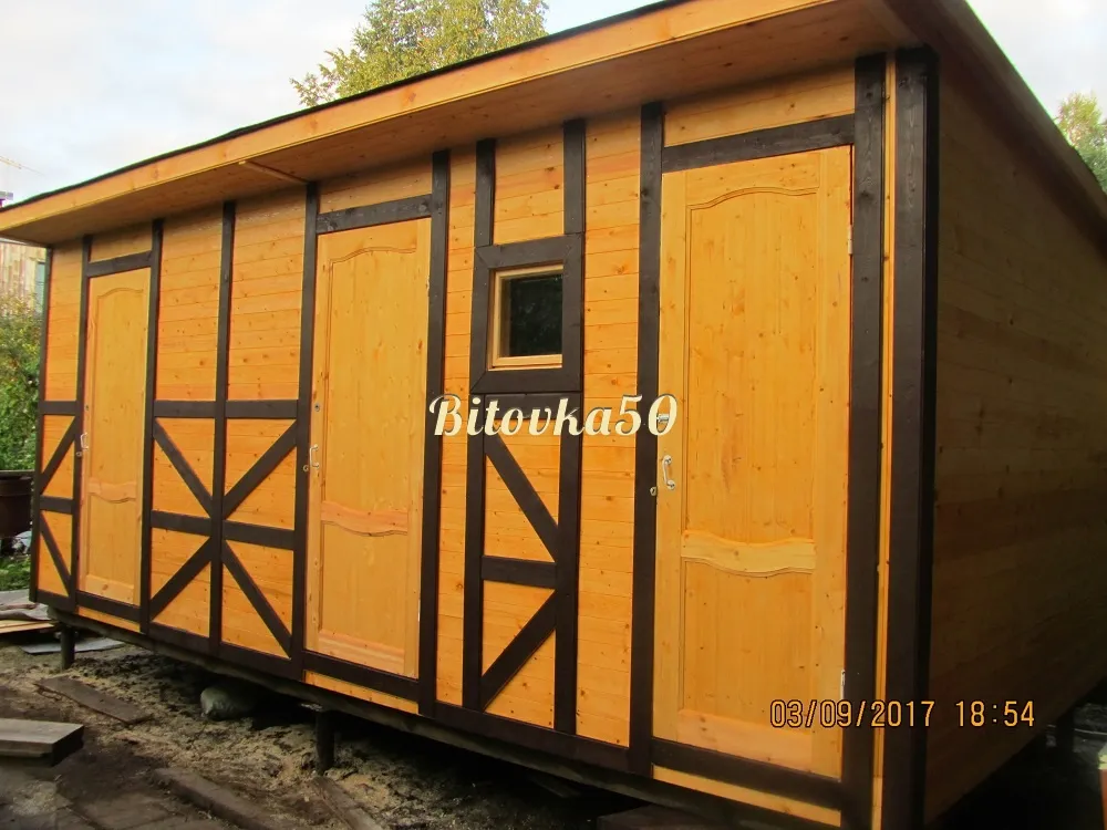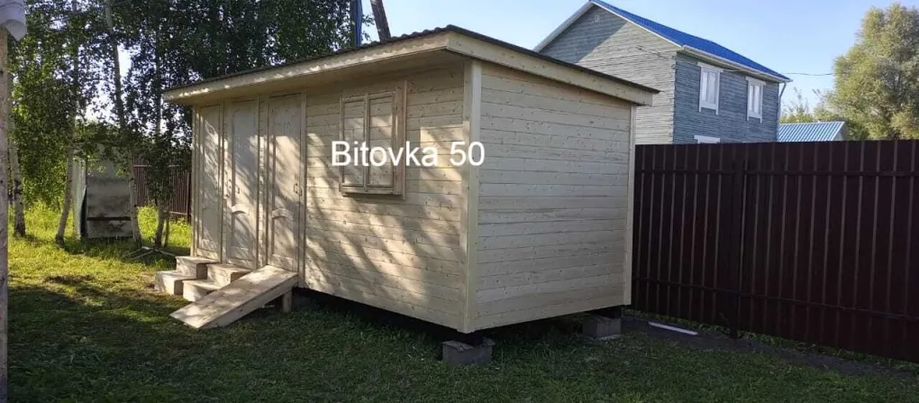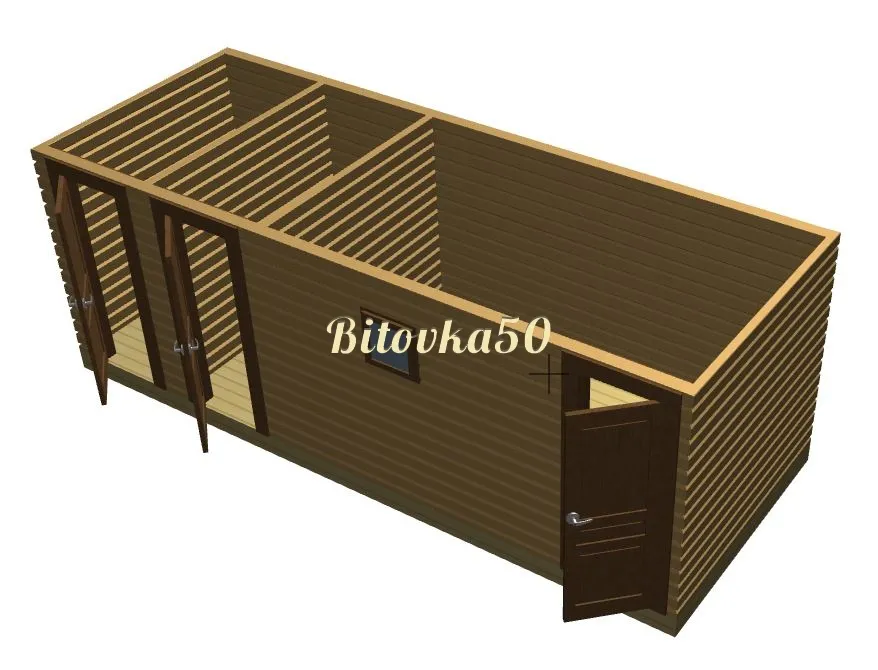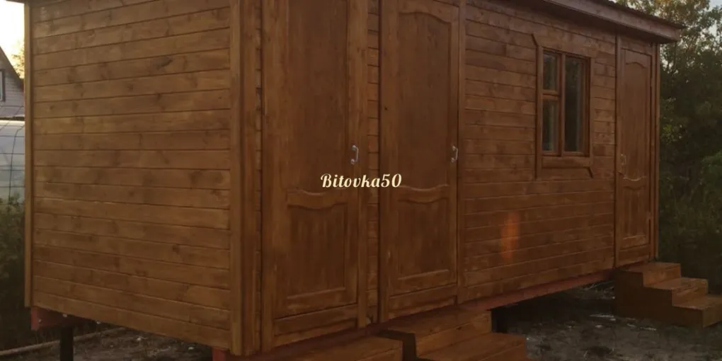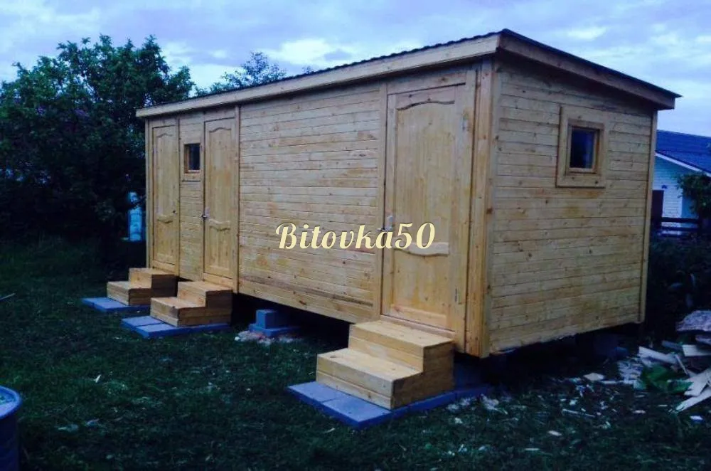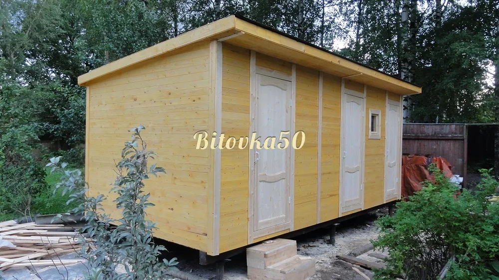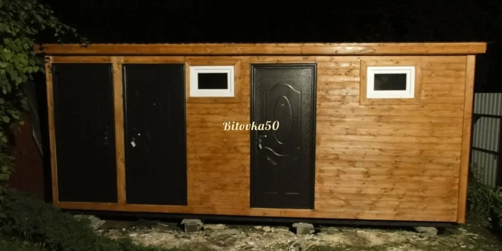 Деревянная дачная бытовка из трёх отдельных секций может использоваться в качестве жилого дома или подсобного помещения. Эта модель дачной бытовки состоит из одной комнаты и двух изолированных помещений с отдельным входом, которые могут служить кладовками или туалетом и душевой. Каждое помещение имеет отдельную входную дверь, в большой комнате предусмотрено заводское окно размером 1 × 1 метр с одинарным остеклением. Наружная и внутренняя обшивка садового дома — хвойная евровагонка высокого качества.