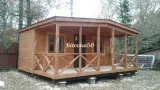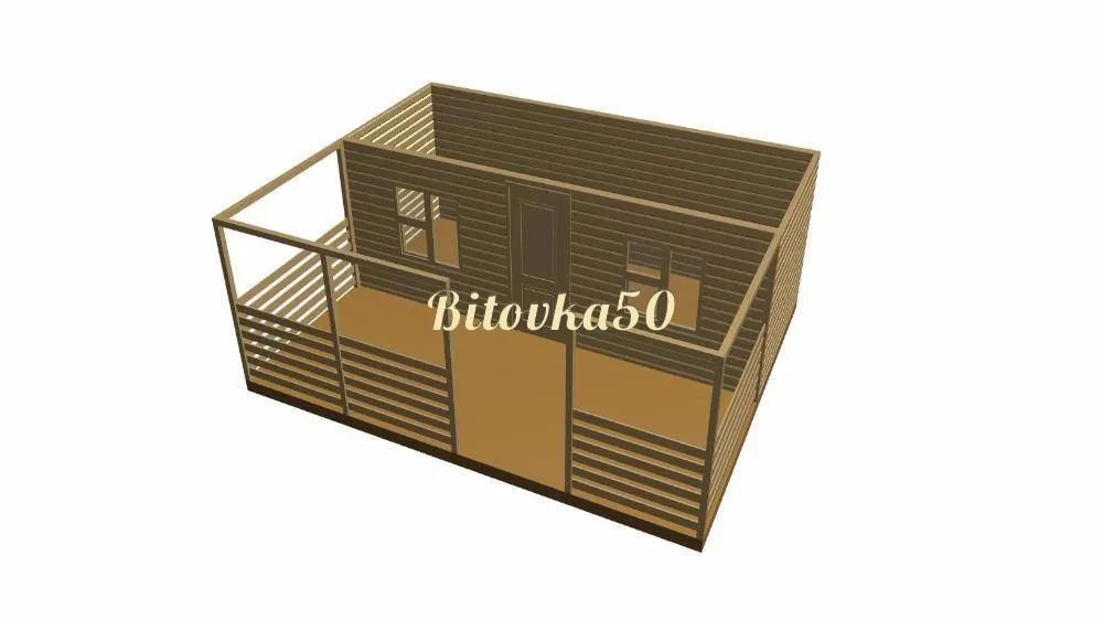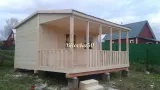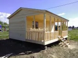 Сборный садовый дом состоит из жилой комнаты и просторной открытой веранды. Жилое помещение с двумя окнами без перегородок позволяет рационально использовать пространство: внутри комнаты можно оборудовать спальные места и поставить кухонный гарнитур, а для семейных обедов и чаепитий отлично подойдёт веранда. В стандартную комплектацию здания входит филёнчатая входная дверь и два окна размером 1×1 метр с двойными рамами и одинарным остеклением. По желанию заказчика, можно установить внутри жилых помещений деревянные перегородки и сделать две изолированных комнаты. В качестве наружной и внутренней обшивки дачного домика используется первосортная хвойная вагонка. Для дополнительной защиты от воздействия влаги и солнечных лучей наружную поверхность деревянного дома покрывают слоем лака или антисептической пропитки.